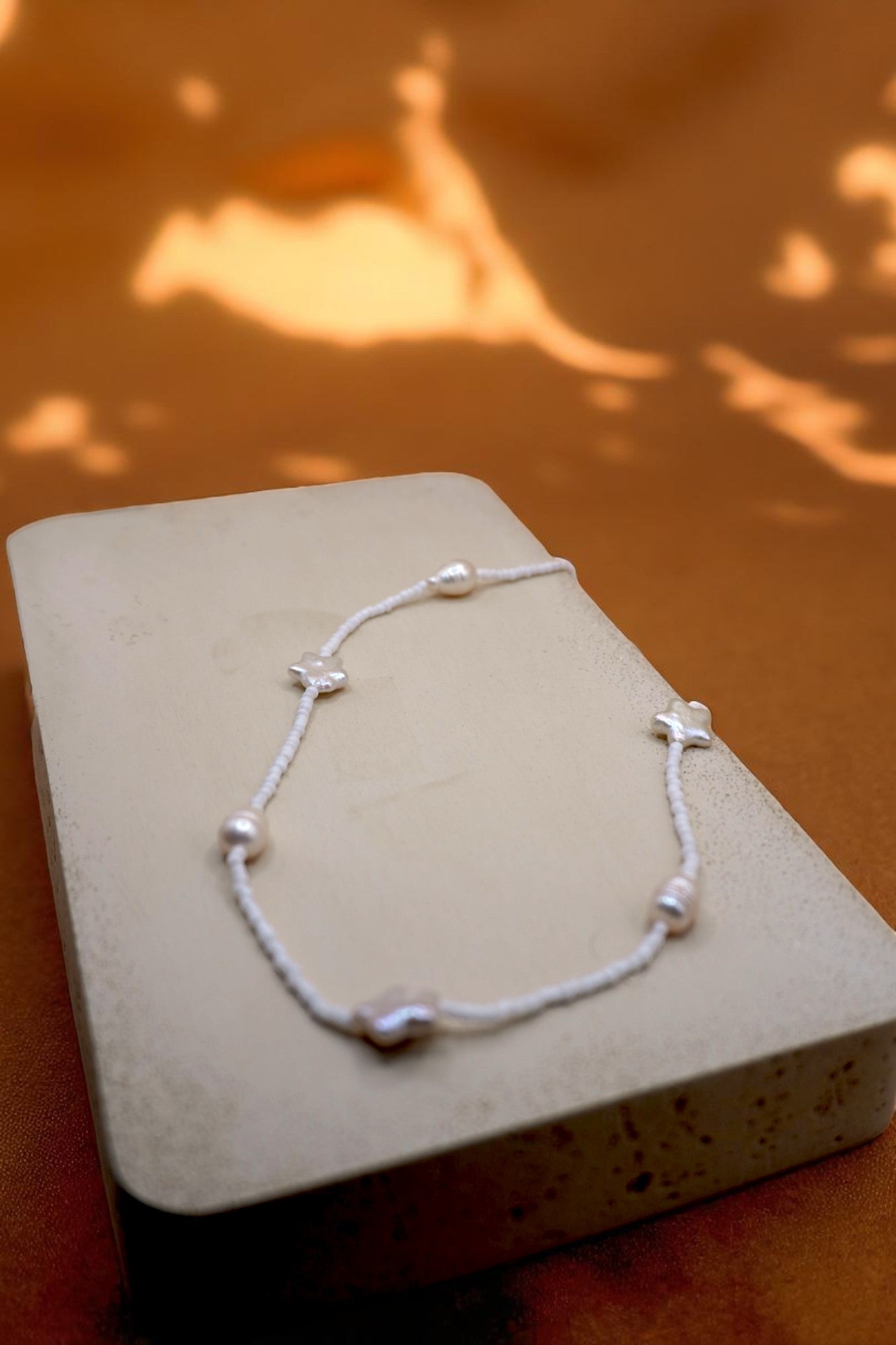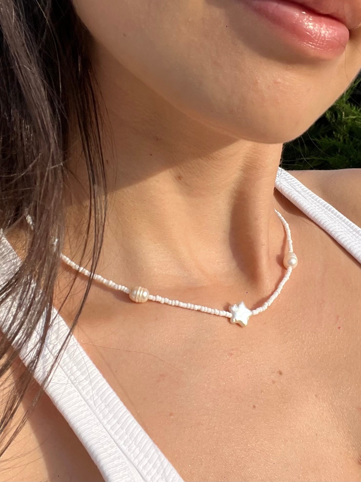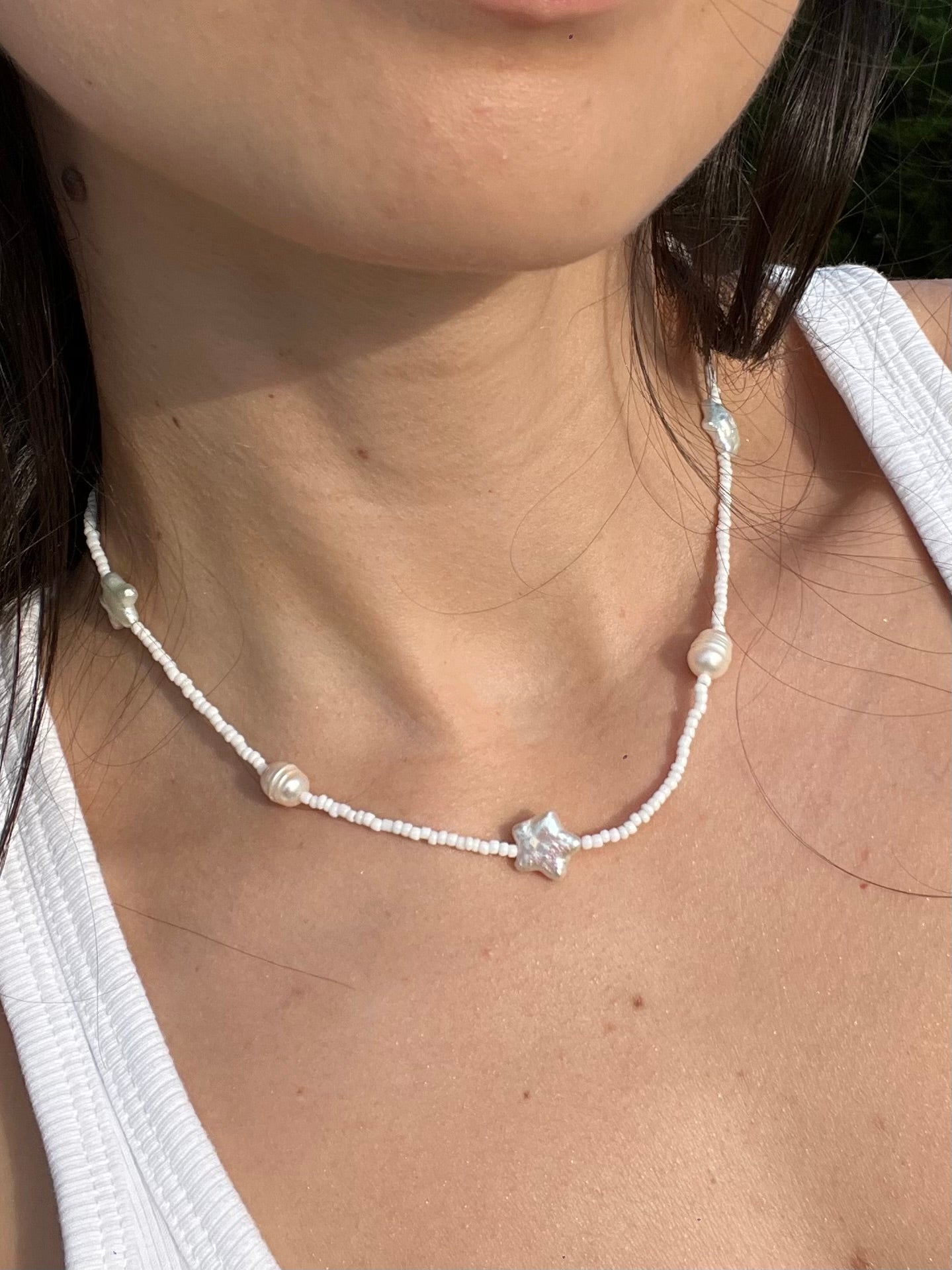 Made with mini cultured pearls, iridescent shell stars, glass beads, and stainless steel details.