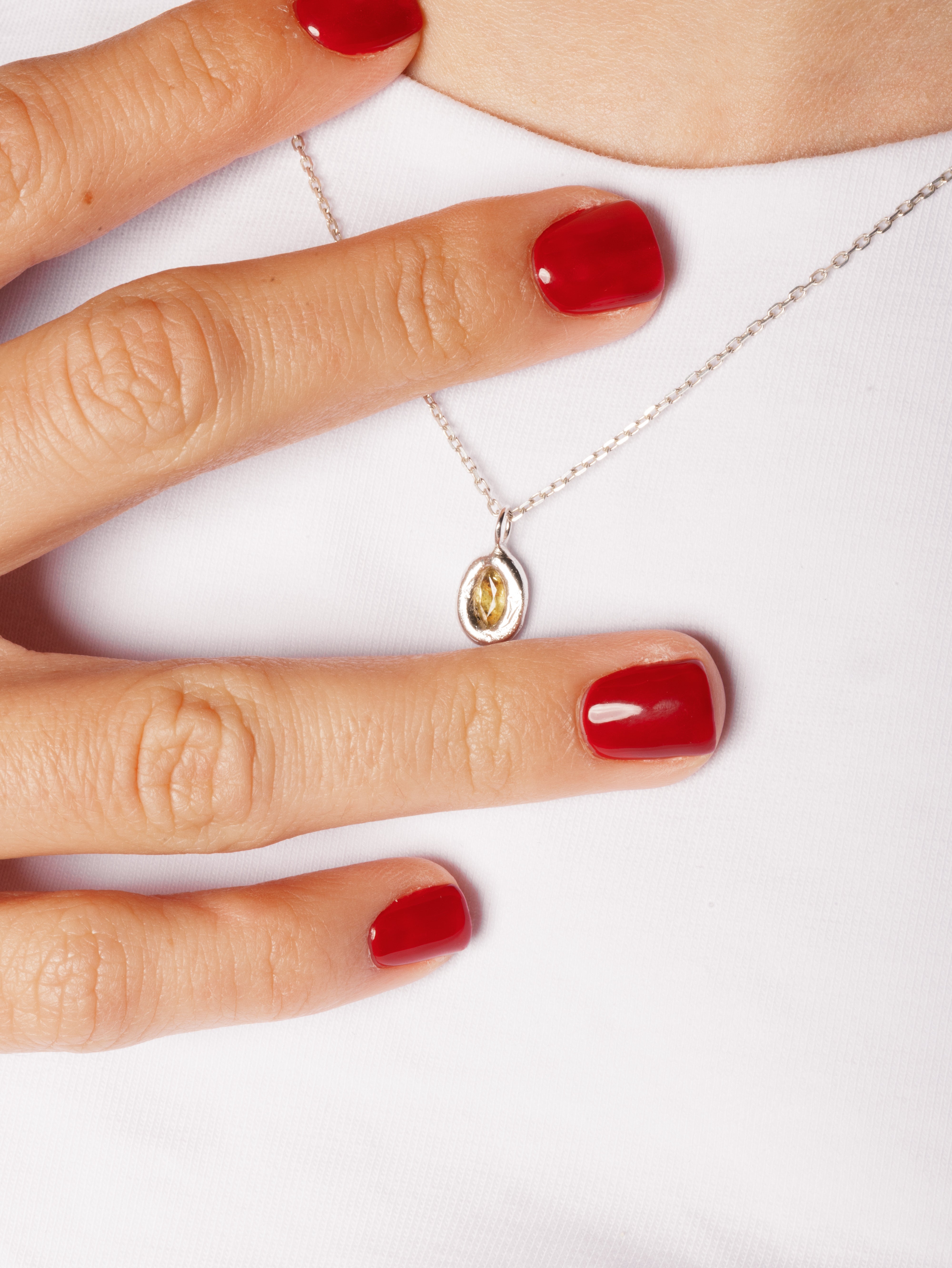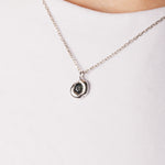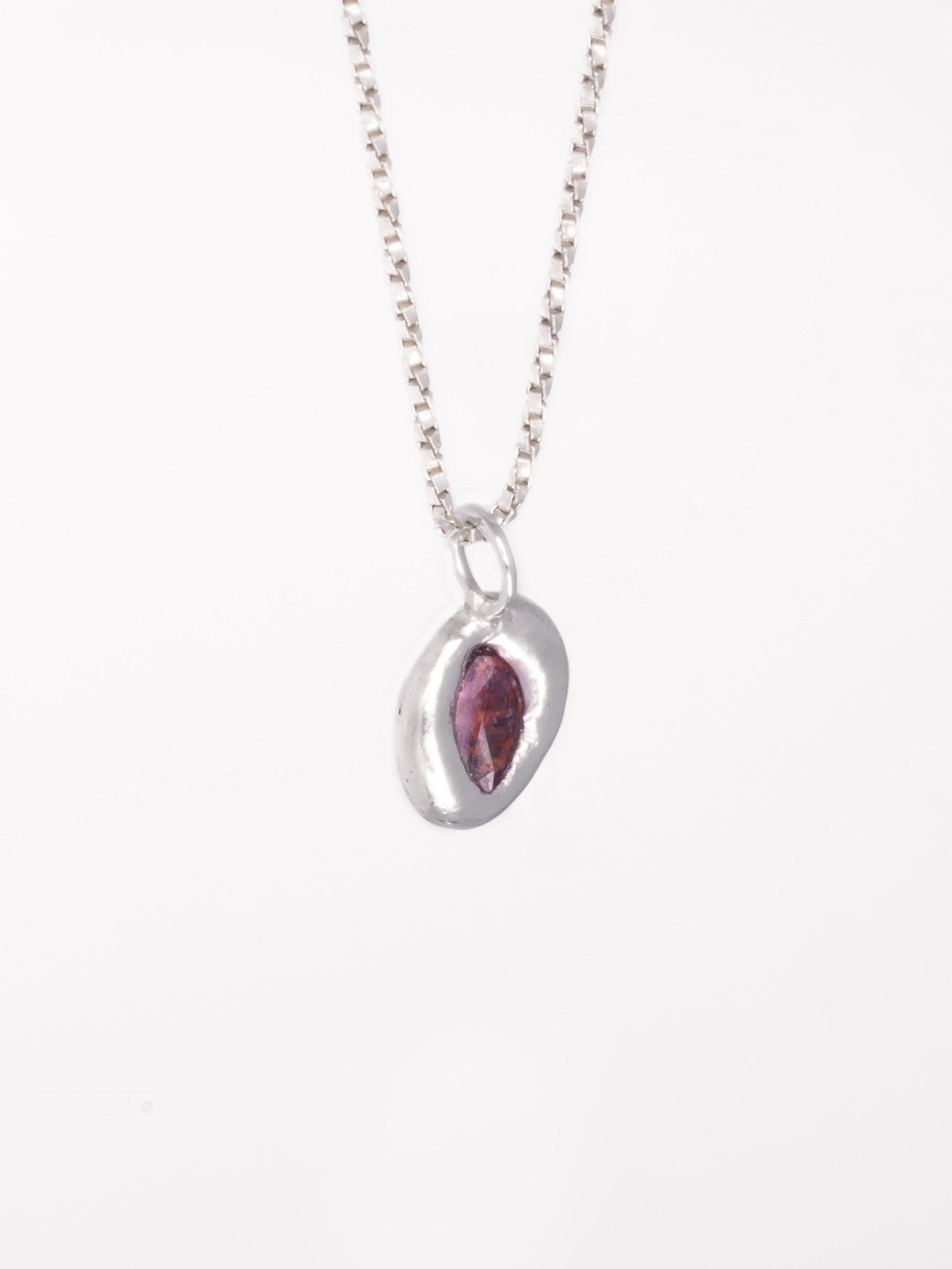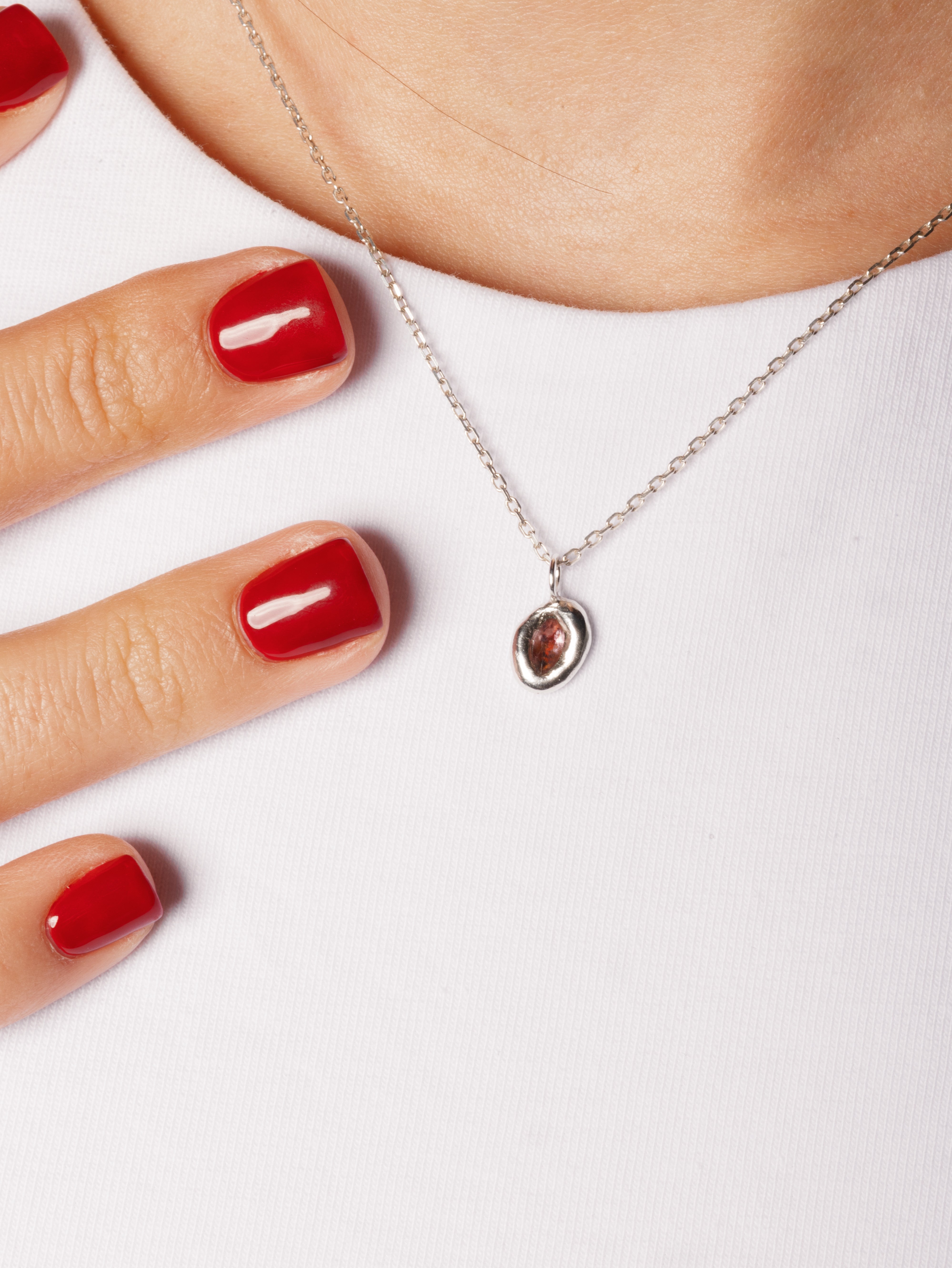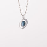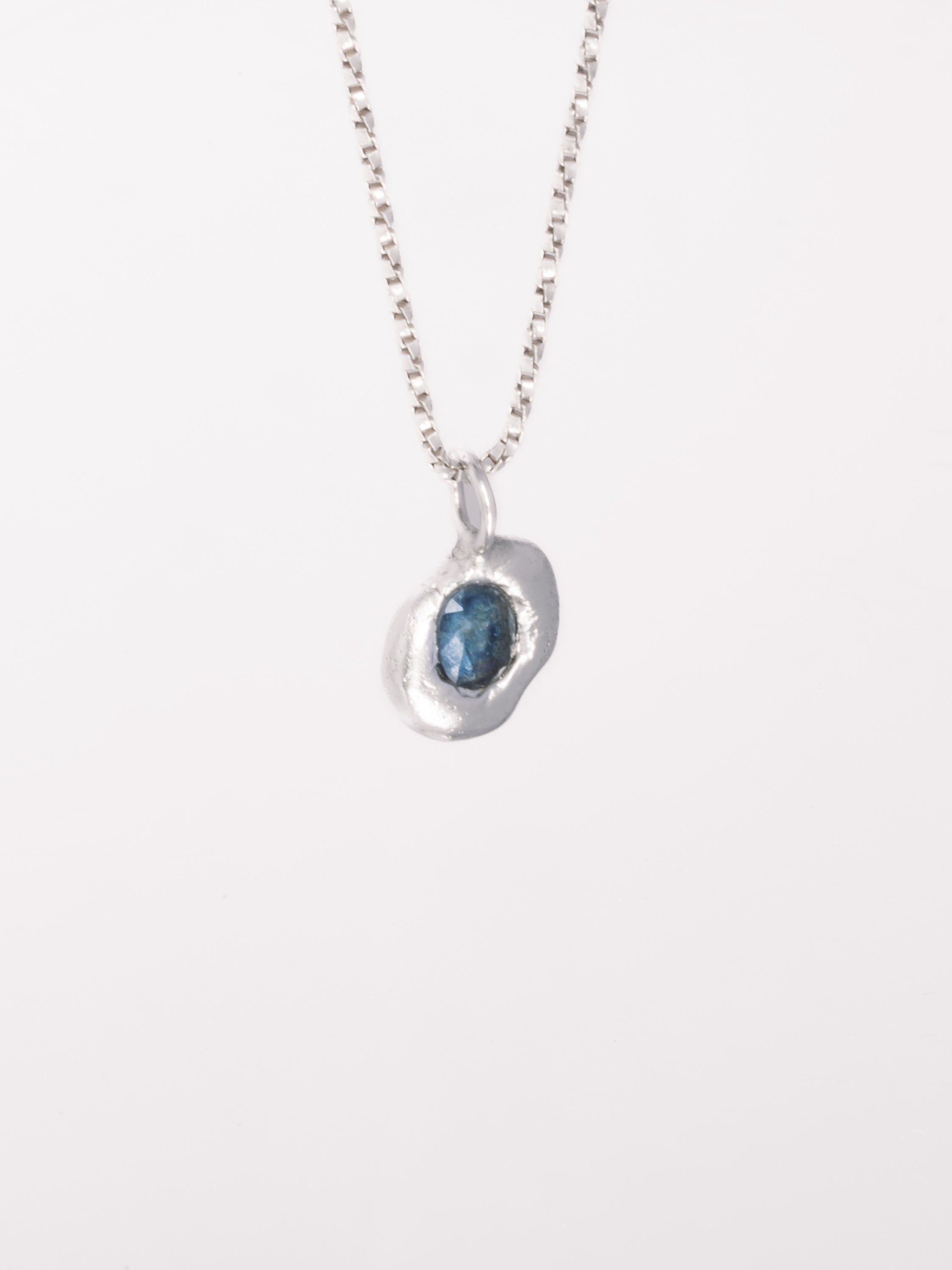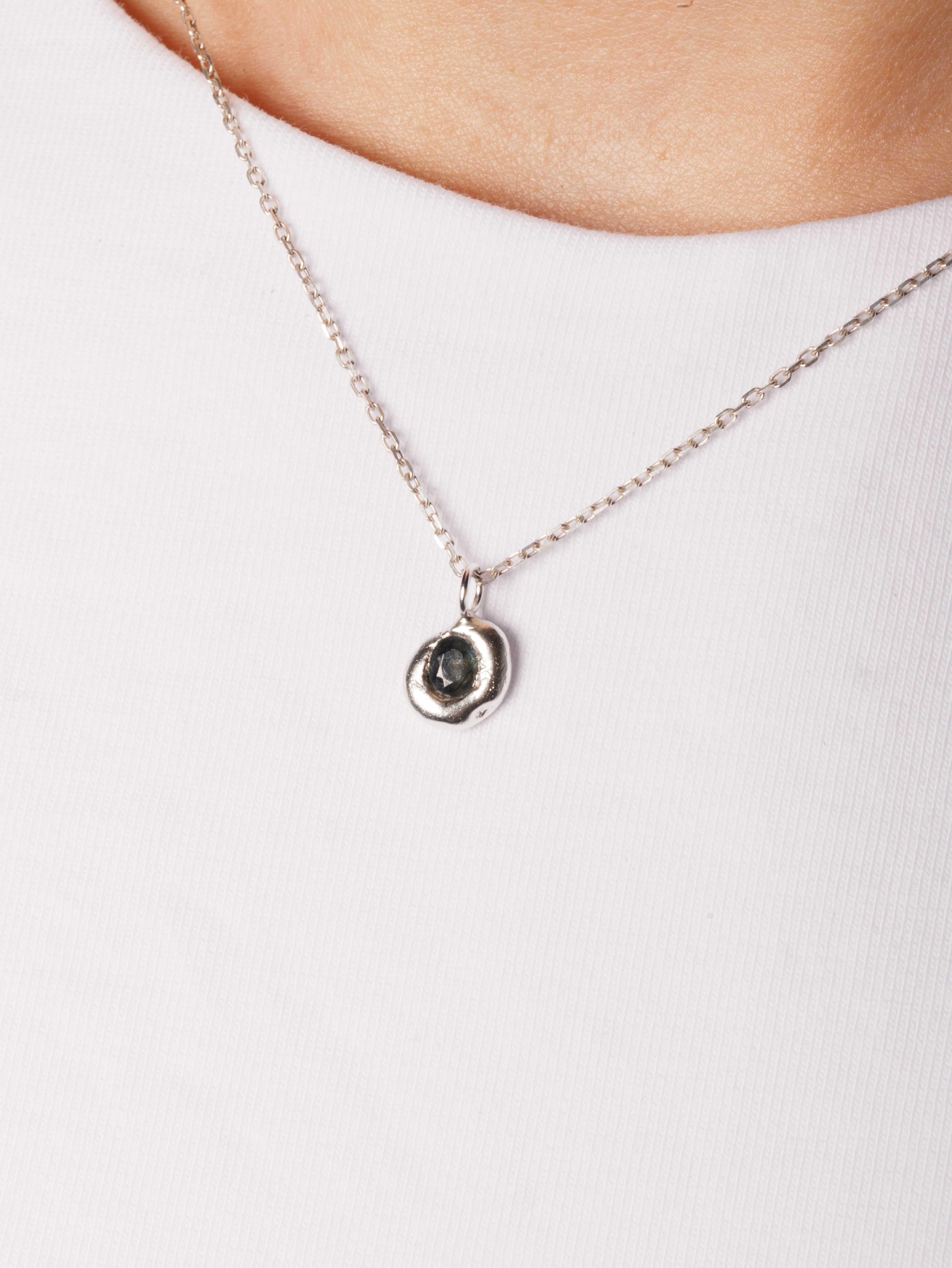 Halo Necklace este un colier minimalist din argint 925, cu un pandantiv turnat manual ce păstrează o formă organică, ușor imperfectă. În centru se află un safir natural, montat într-un stil curat și modern.