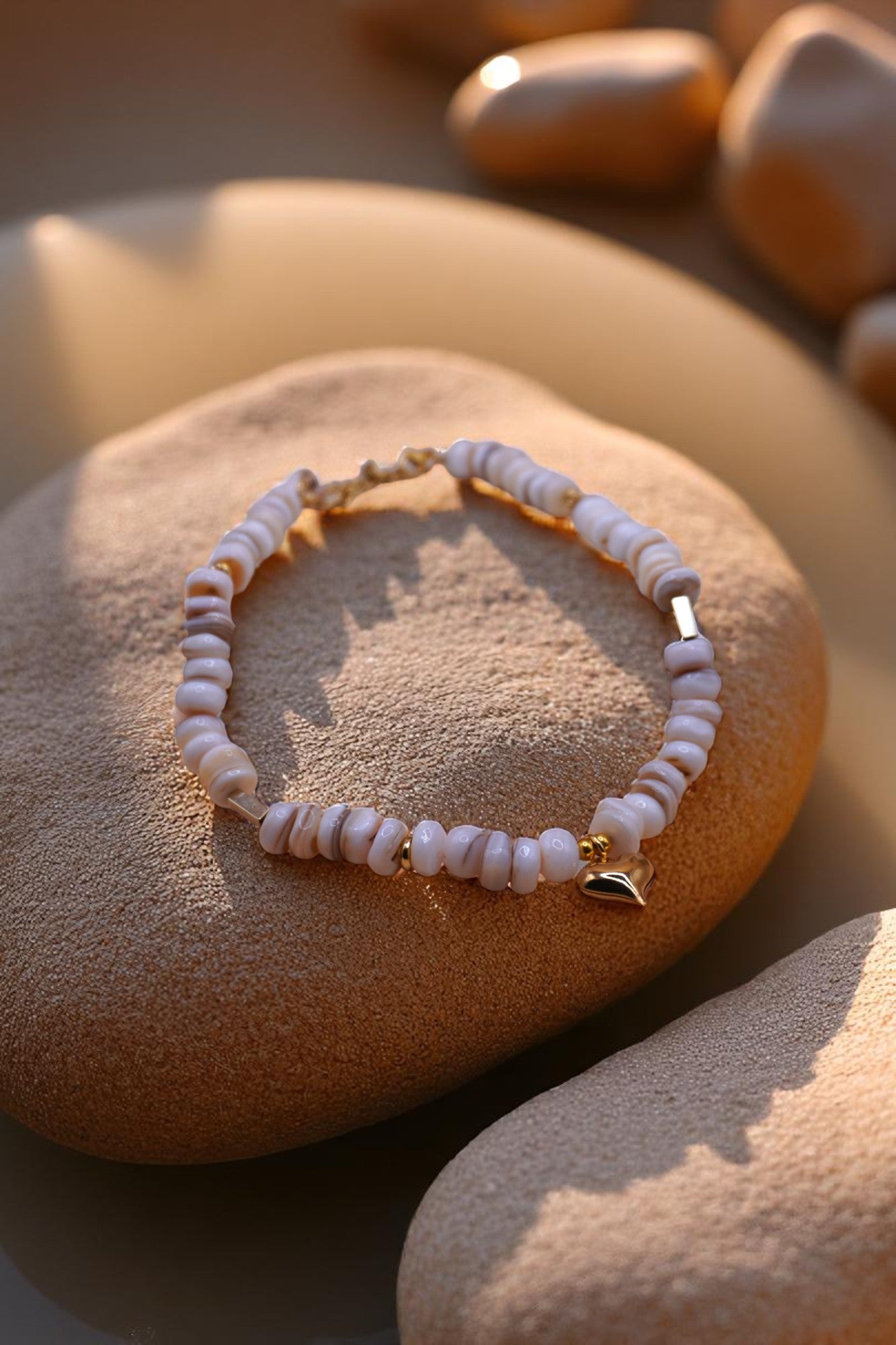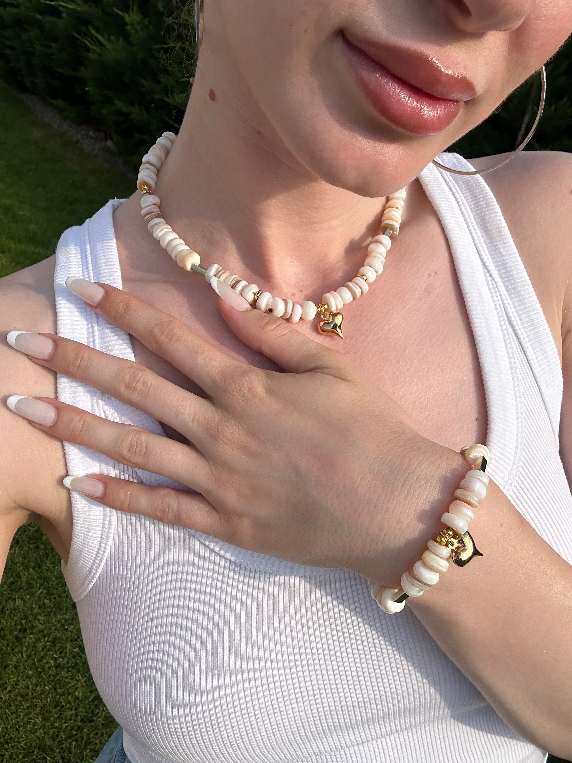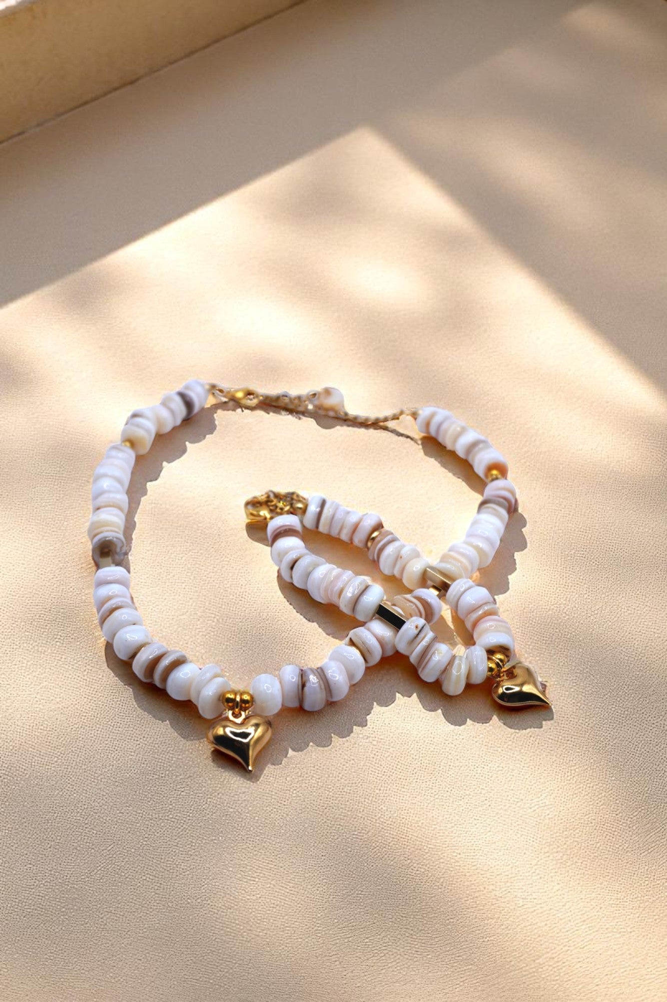 Golden Shells is a delicate matching set made with natural mother of pearl beads, known for their feminine, soothing energy and oceanic glow. Each piece is accented with a gold-tone stainless steel heart charm — a symbol of love, softness, and light.
