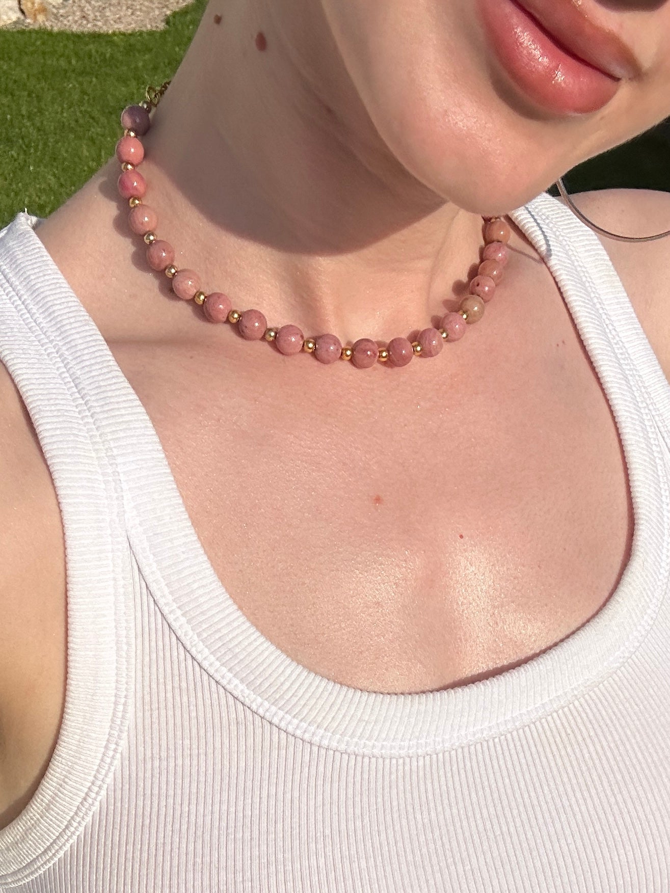 Handcrafted with pink Rhodochrosite, this necklace carries the energy of compassion, self-love, and emotional healing. Each bead resonates with heart-centered intention, reminding you to move through the world with tenderness and truth.