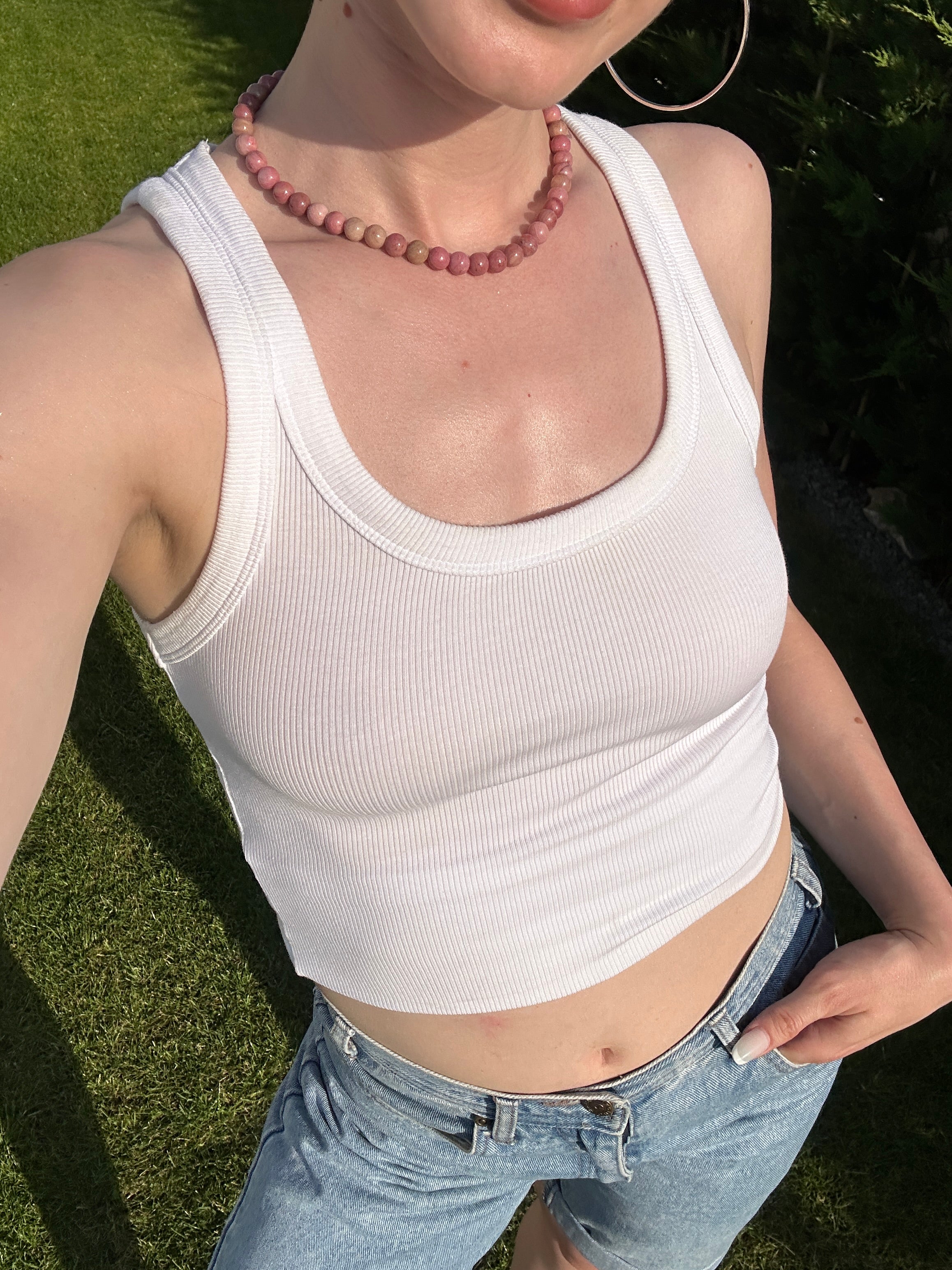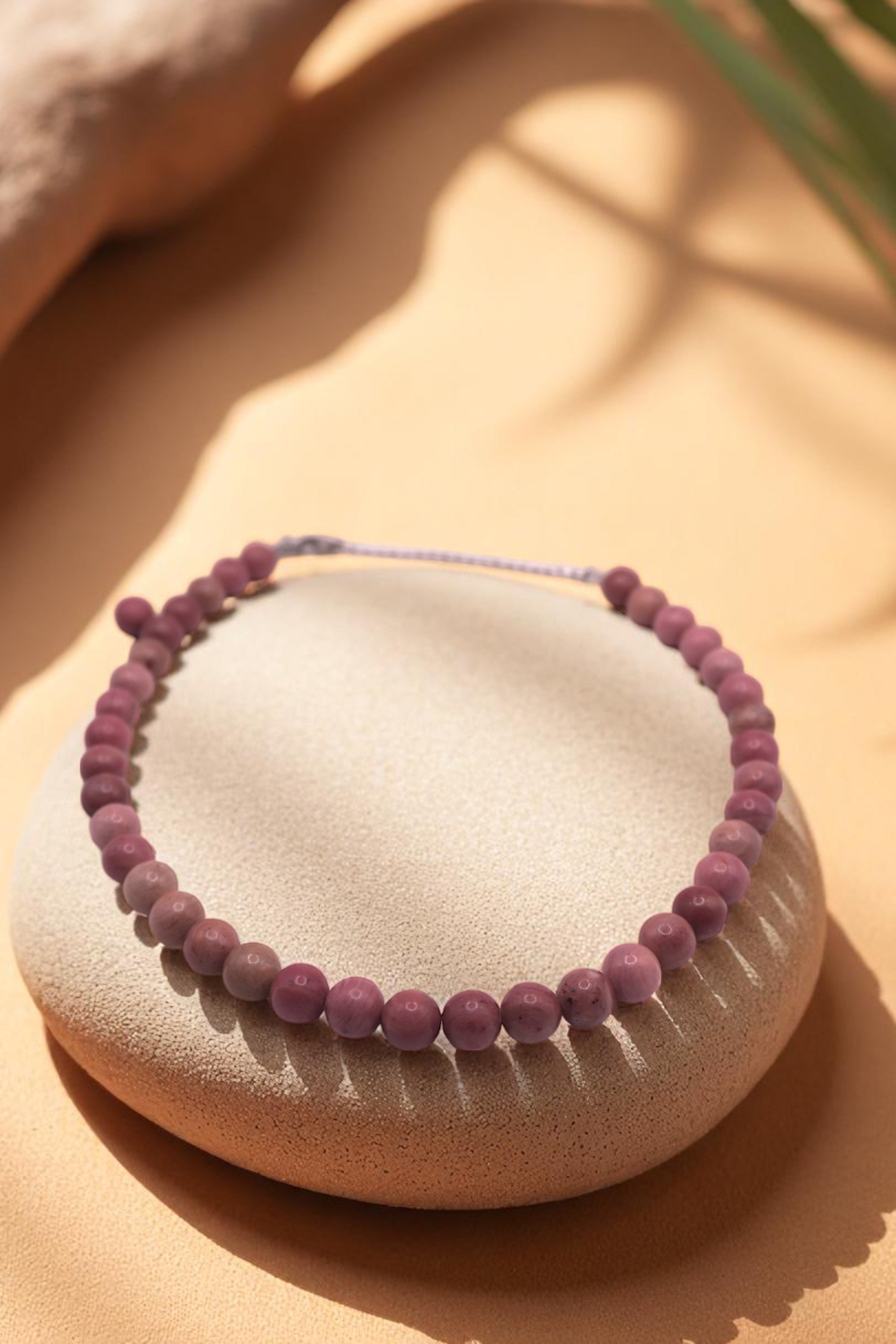 A quiet glow, like moonlight on skin. Moonblush features soft pink rhodochrosite beads, a stone of heart-deep healing and emotional balance. Finished with silver-tone stainless steel, this choker brings a clean, lunar energy into your daily rituals.