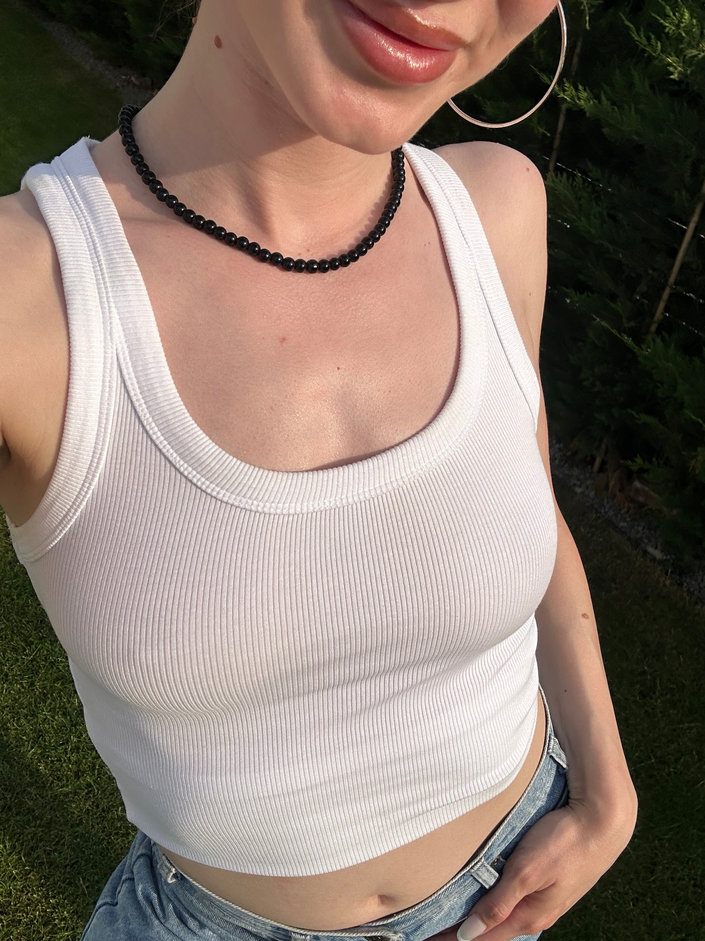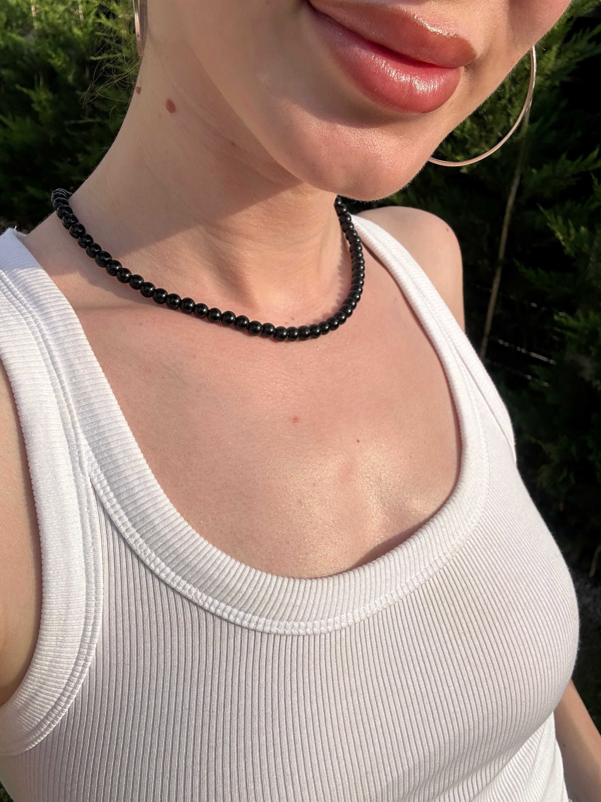 Bold in its simplicity. Shadowline is made with matte black glass pearls — classic, minimal, and versatile. Finished with silver-tone stainless steel, this piece is perfect for stacking or wearing solo. It comes in a standard 40 cm length with a 10 cm extension, but can also be made shorter on request.
