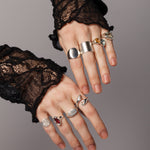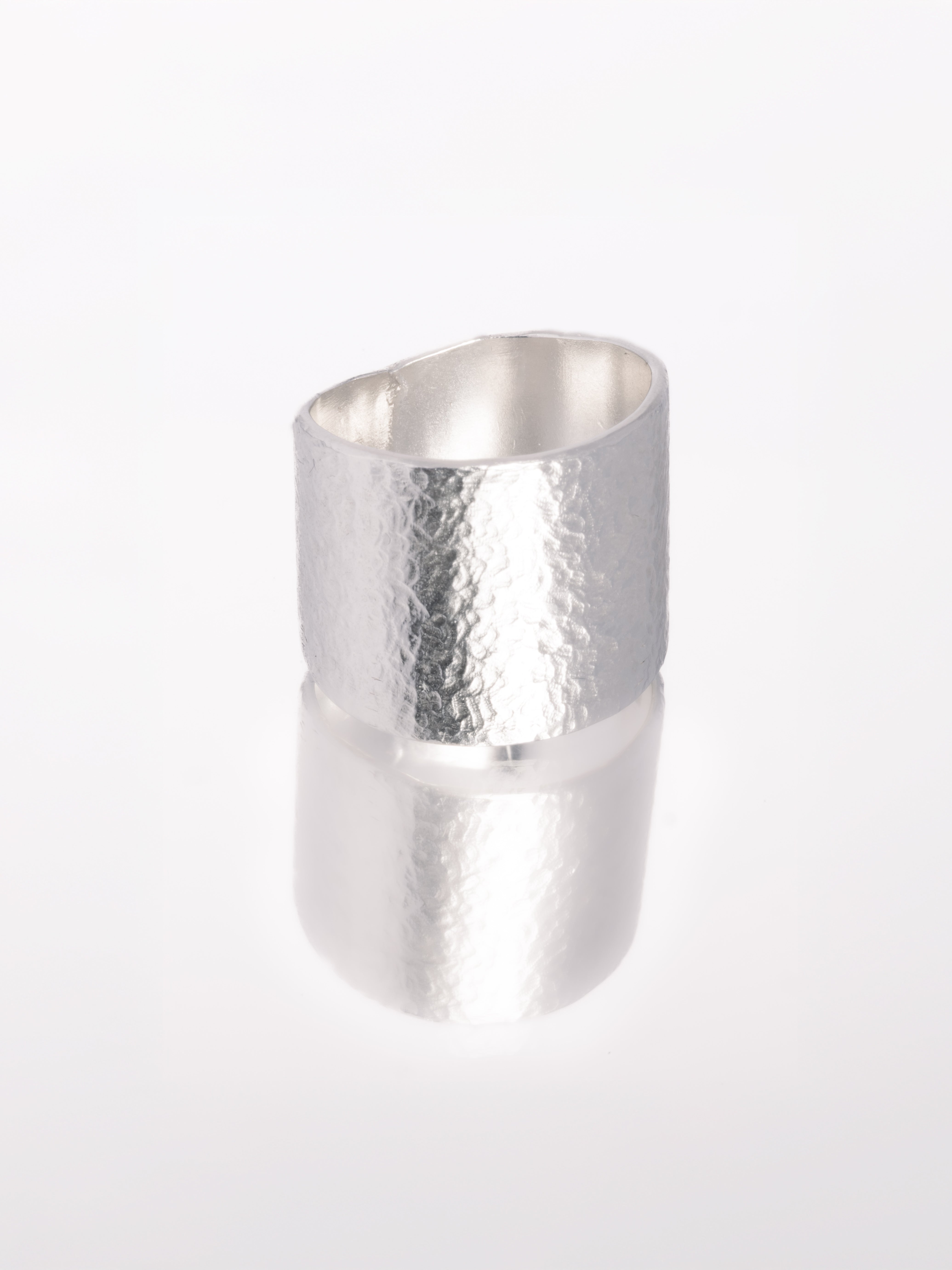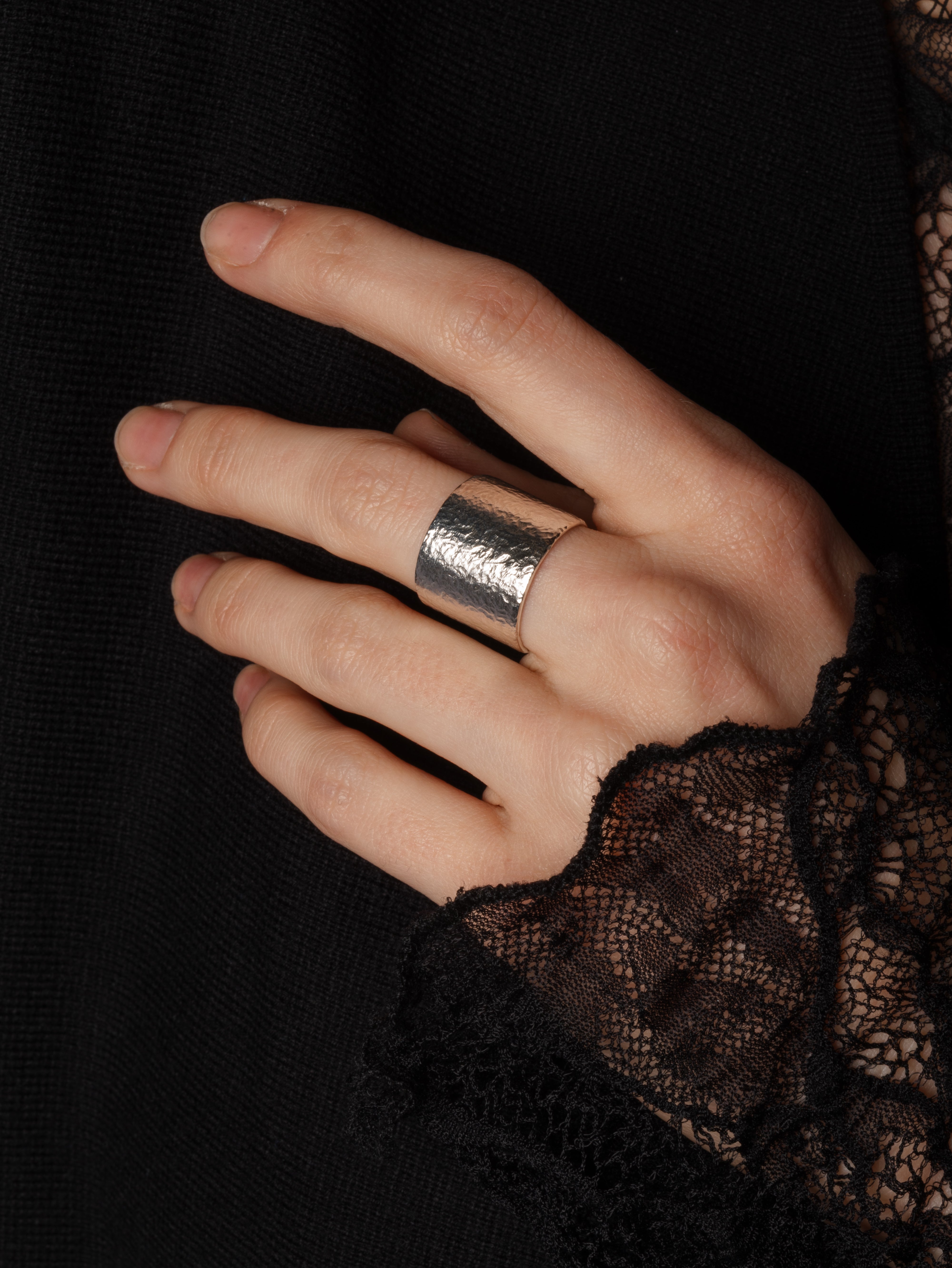 SILVER MOON RING este un inel unisex cu bandă lată, inspirat de textura și lumina calmă a lunii. Suprafața lucrată manual îi oferă un aspect organic, raw și atemporal, iar fiecare inel are o prezență unică datorită finisajelor realizate individual.
