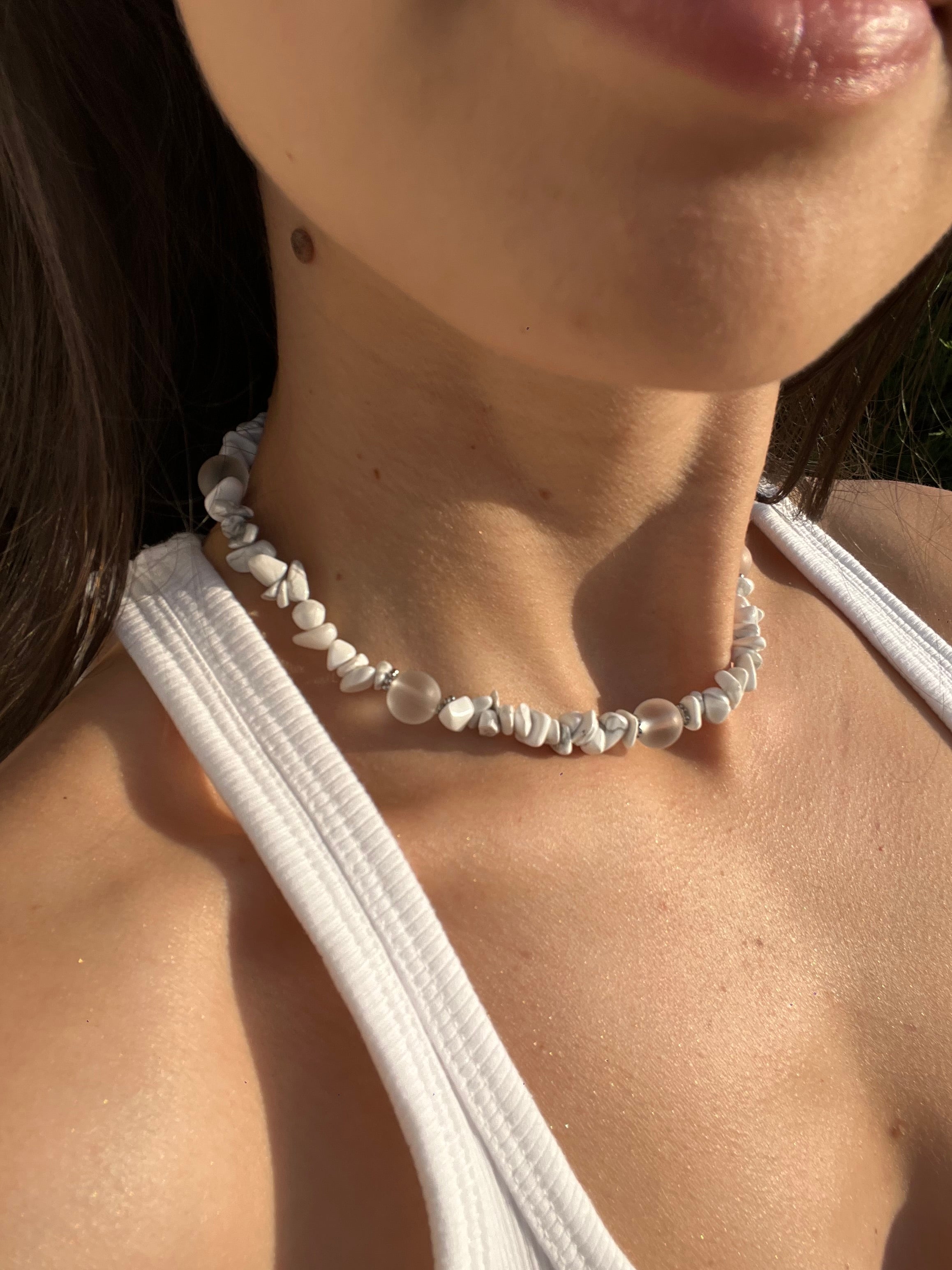 Simple Solstice Spirit is a minimalist piece made with natural Clear Quartz and Howlite – two stones known for their calming, centering, and clarifying energy. With soft shapes and a smooth, matte glow, this necklace brings a sense of balance and presence into your day.