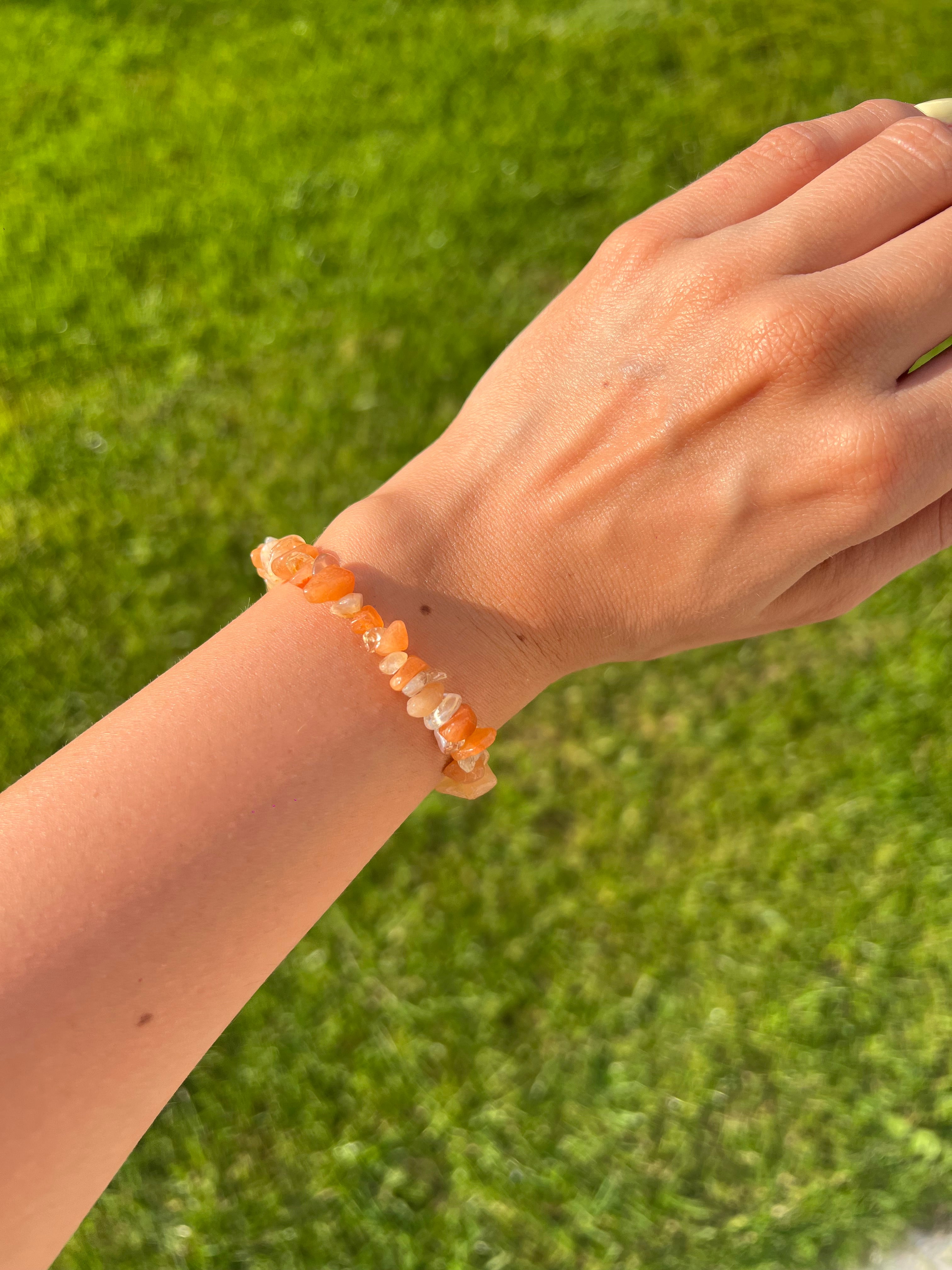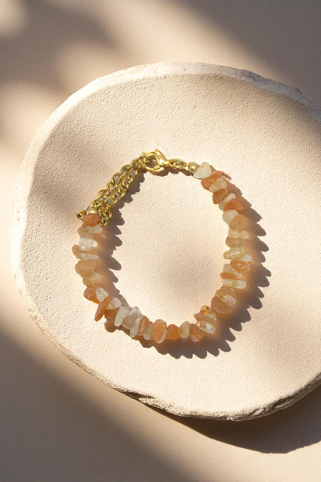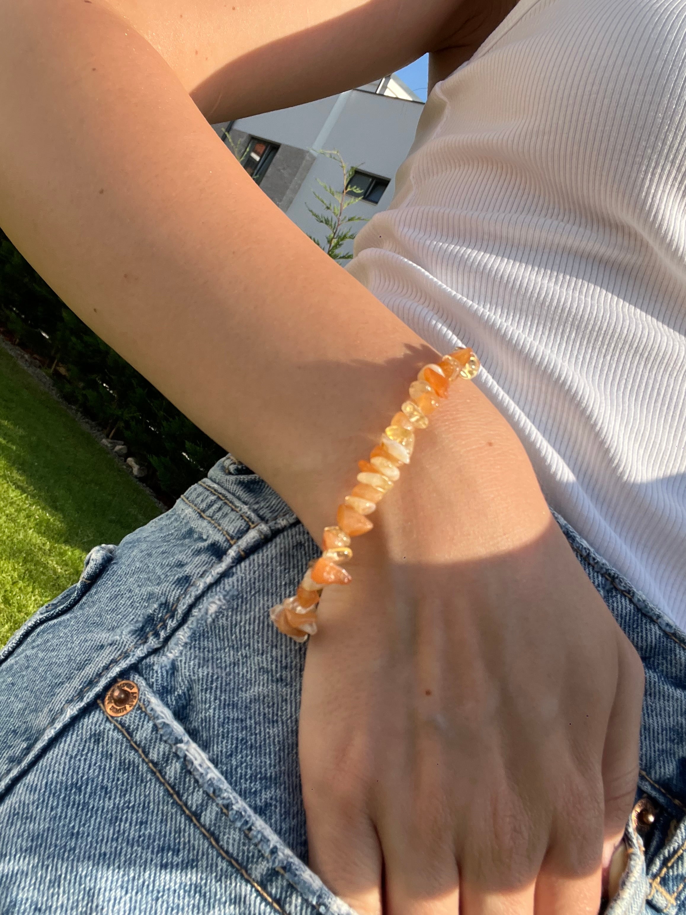 Sunlace is a delicate bracelet made with natural Carnelian and Citrine chips — gemstones that bring energy, joy, and emotional warmth. With golden-orange hues and soft irregular textures, this piece feels like summer captured in stone.