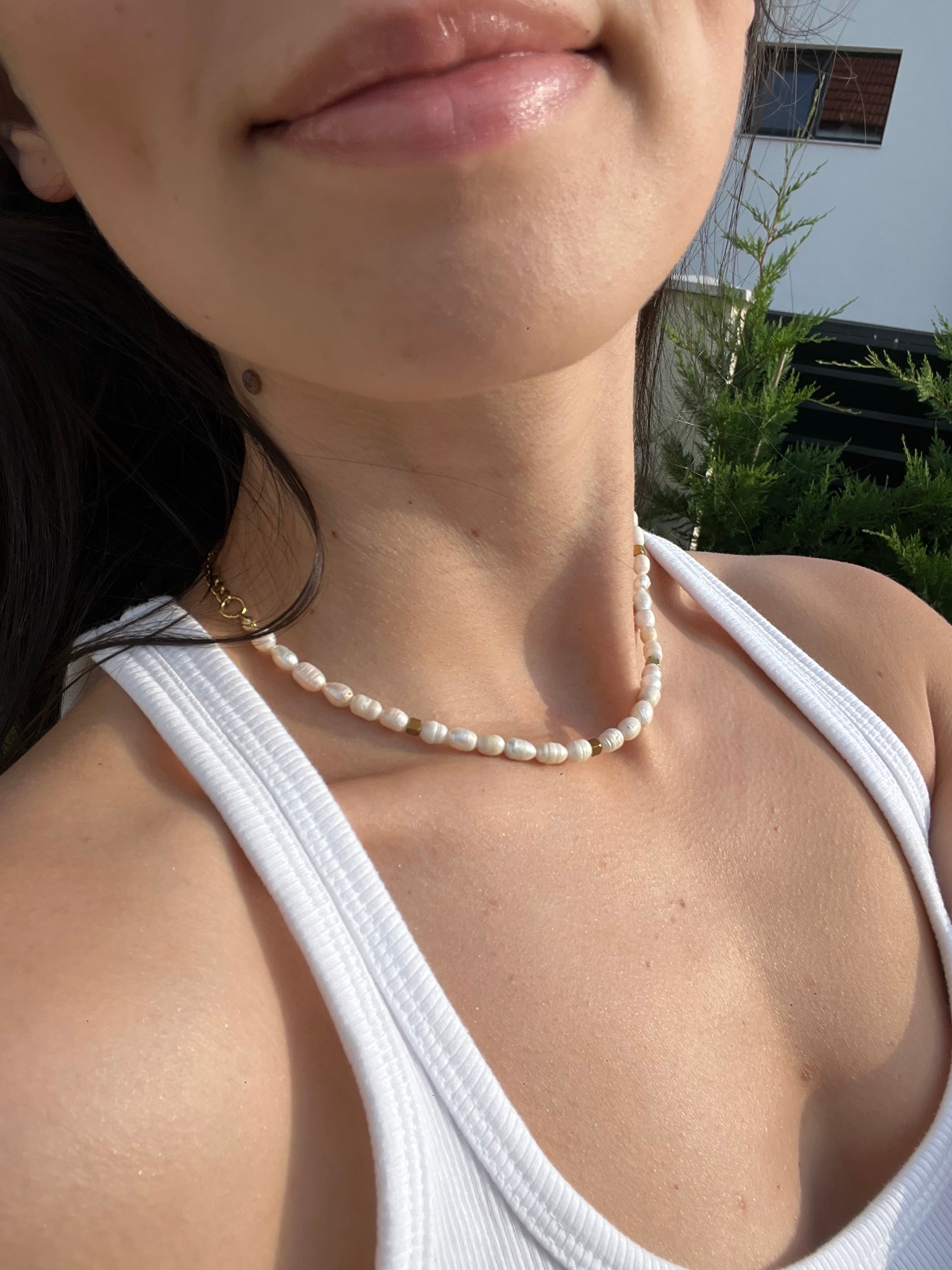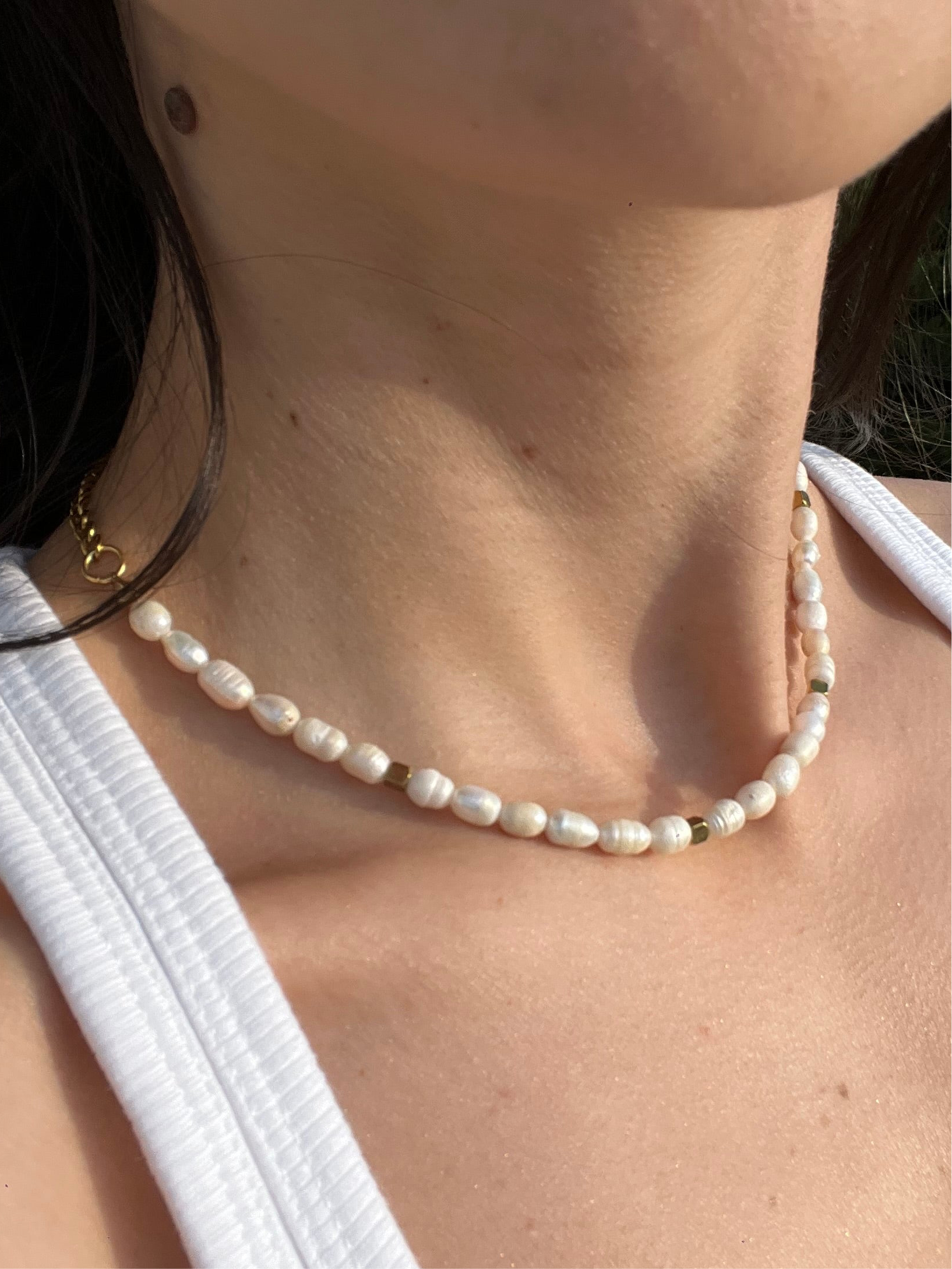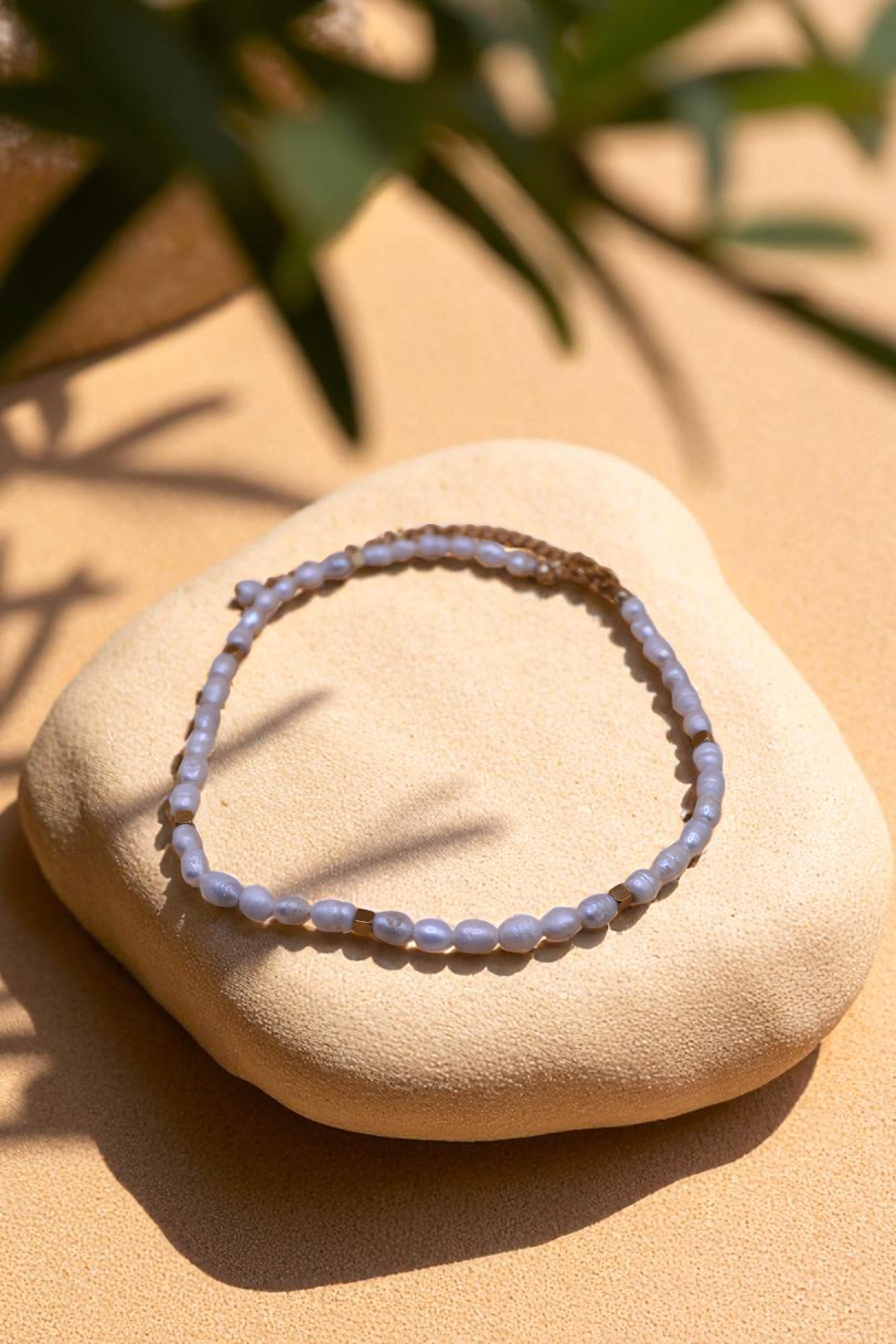 Delicate like a whisper, radiant like a summer glimmer. Sunspill is crafted with tiny rice-shaped freshwater pearls and finished with warm gold-tone stainless steel. Perfect for layering or wearing alone on sun-kissed skin.