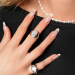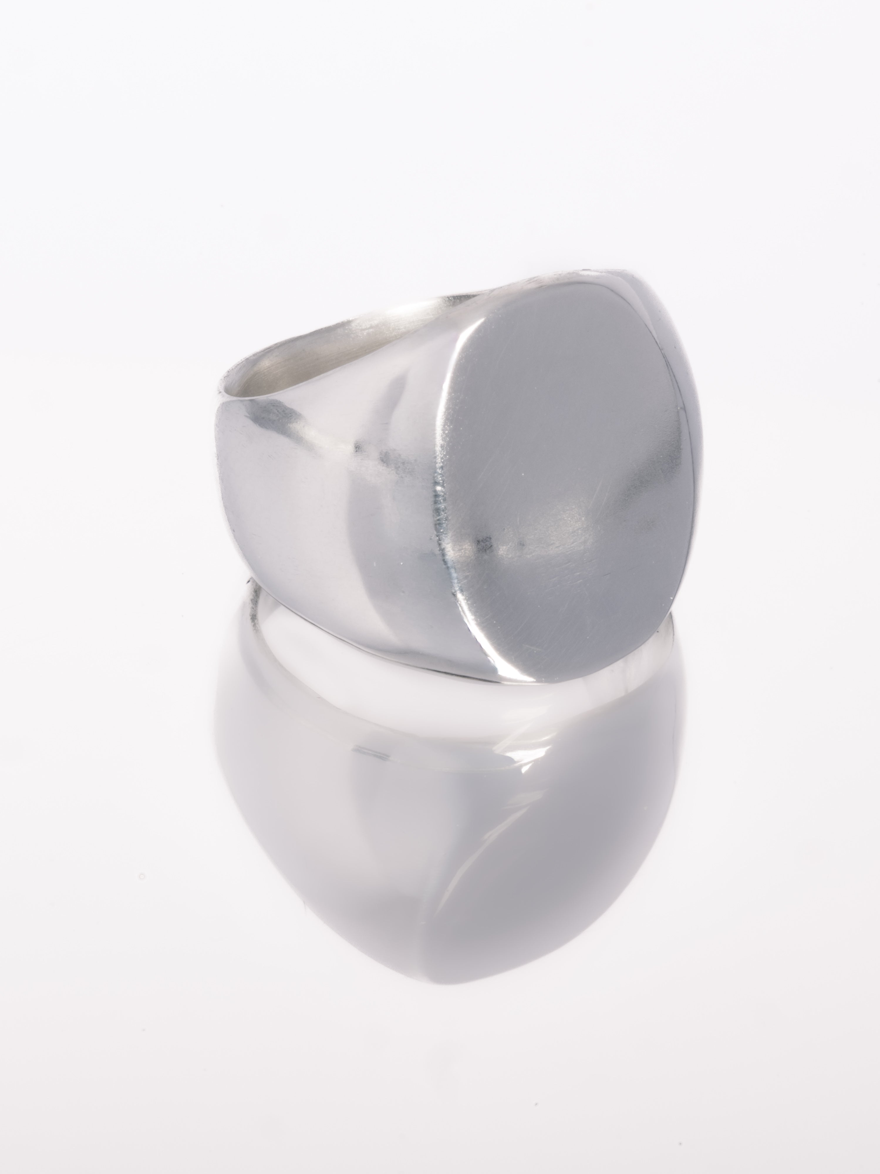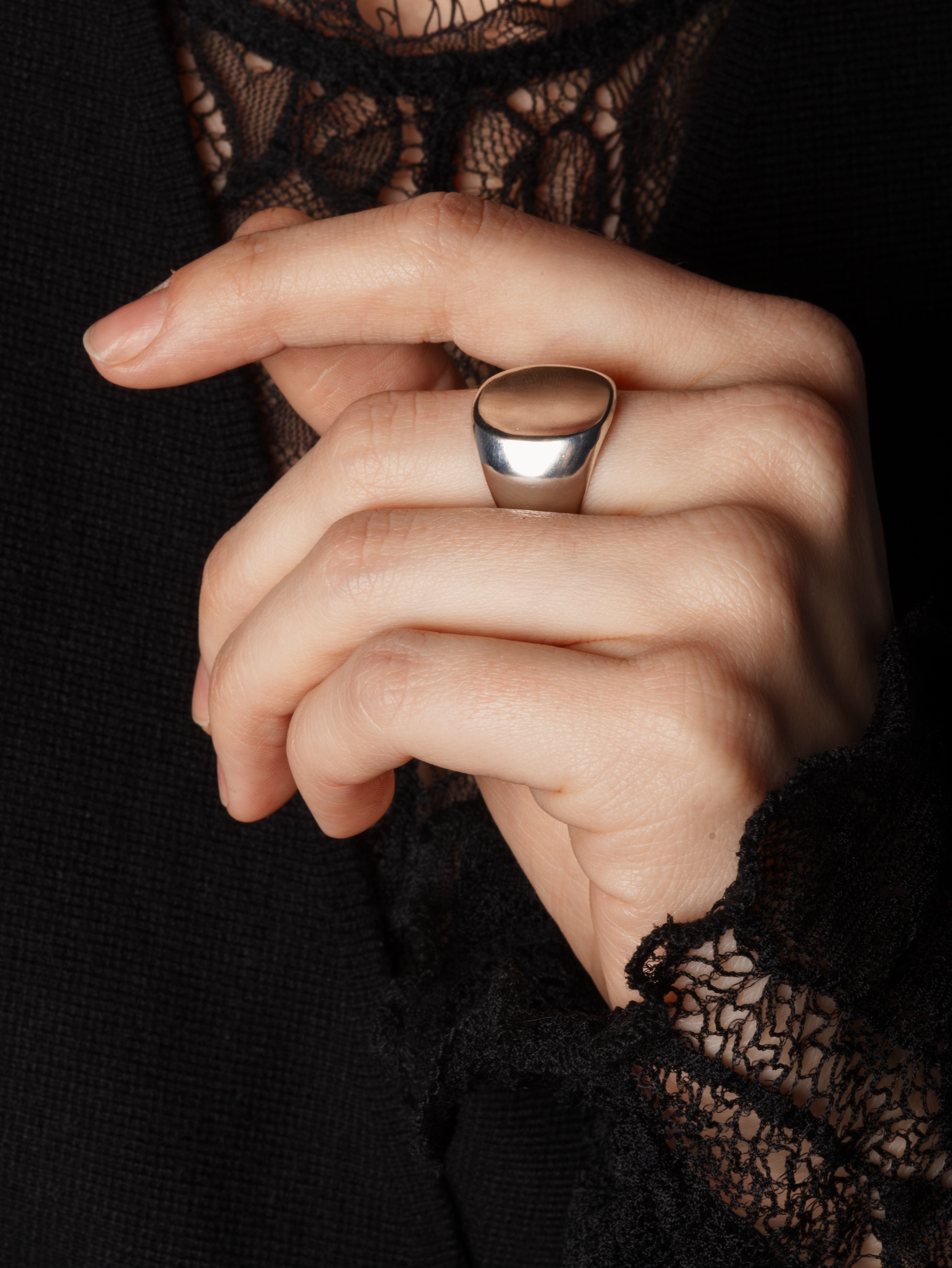 THE ESSENCE SIGNET RING este un inel statement din argint 925, cu o suprafață rotundă, netedă și elegantă. Designul său curat și sculptural este creat pentru cei care iubesc simplitatea premium și formele esențiale.
