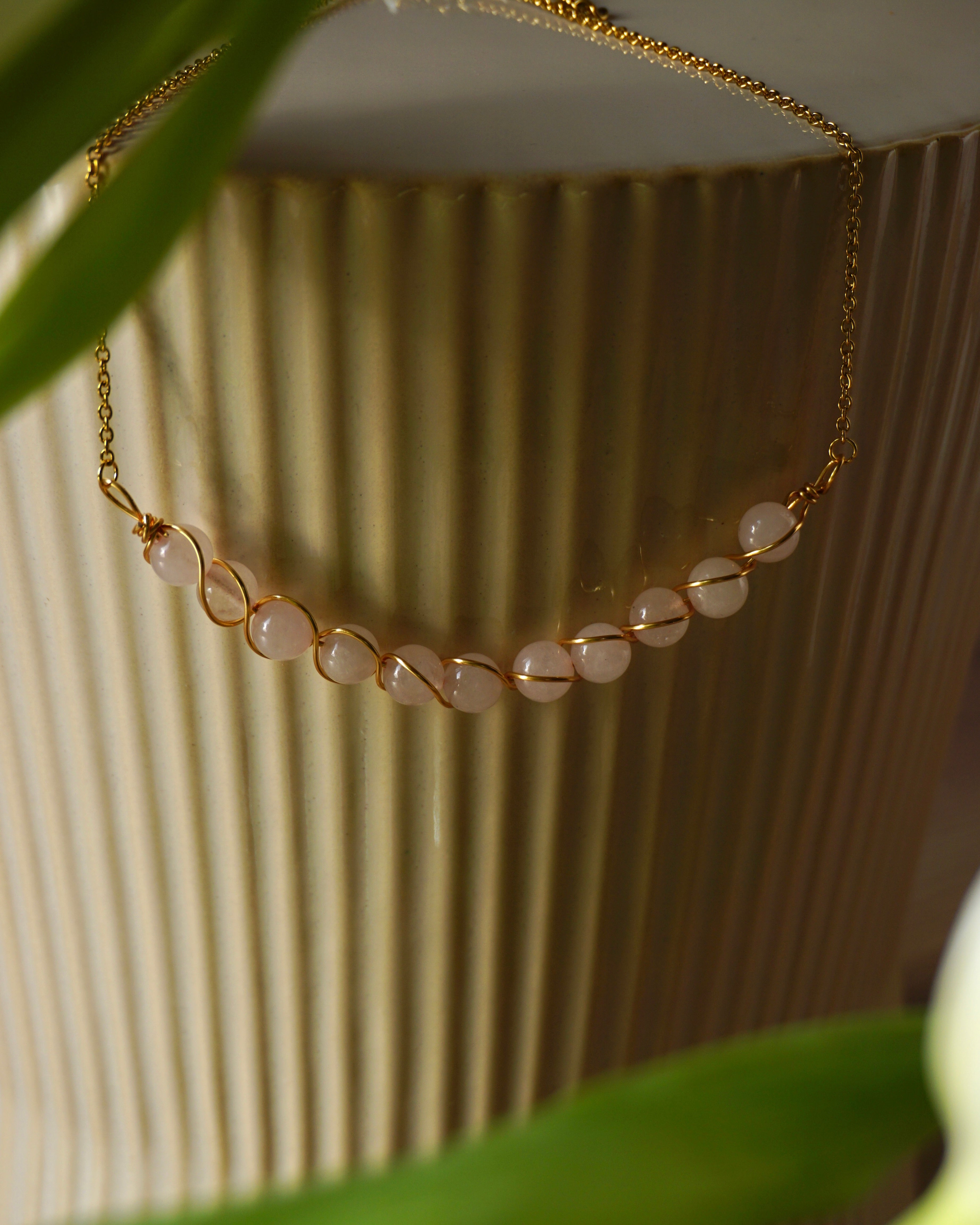 O atingere delicată de eleganță, inspirată de lumina blândă a zorilor. Colierul Aurora surprinde esența serenității și feminității, având ca piesă centrală un cristal natural de cuarț roz—simbol al iubirii, armoniei și echilibrului emoțional.