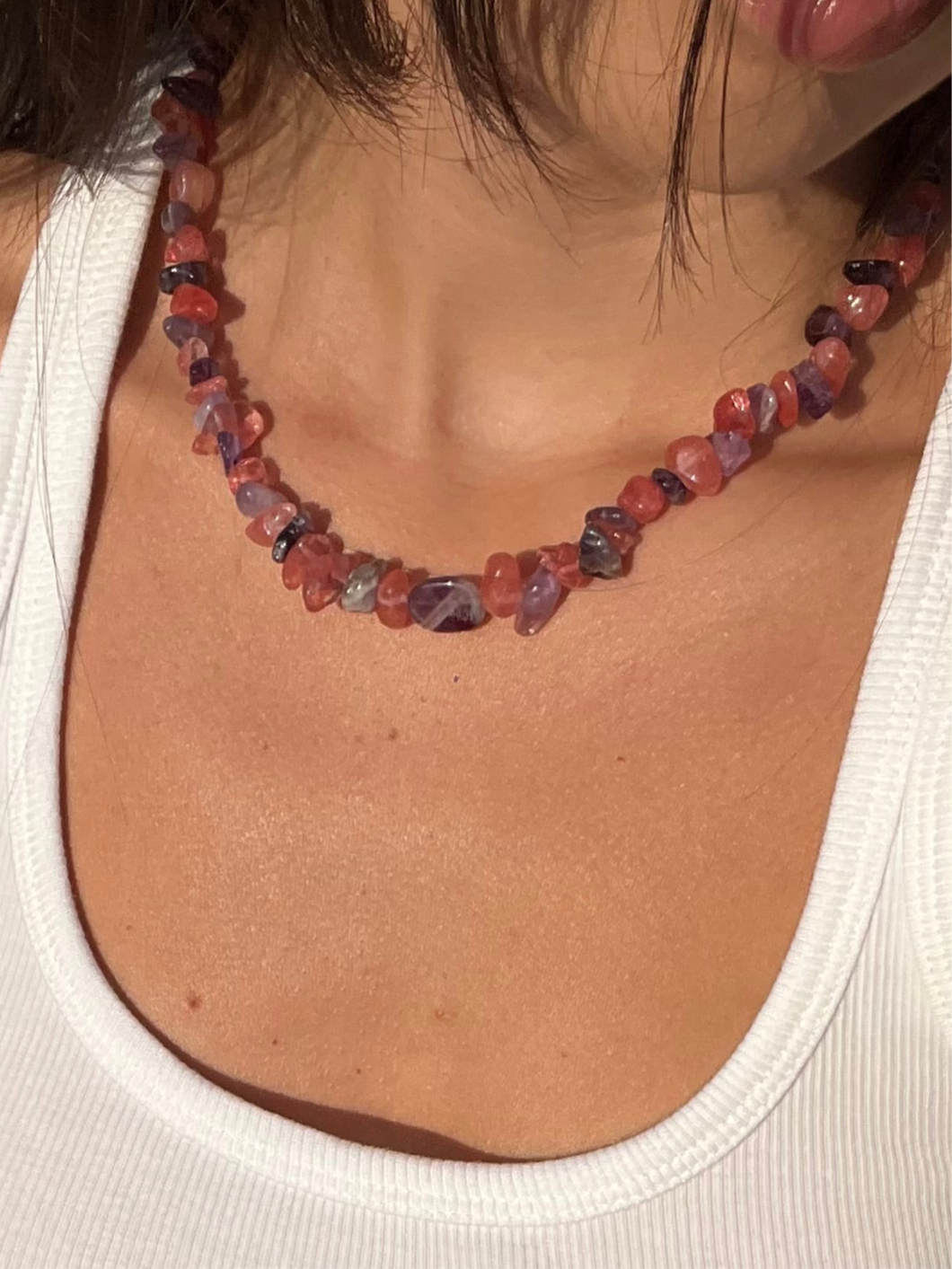 Heartspell este un choker vibrant, realizat din cuart roz și ametist natural — două pietre ce susțin iubirea de sine, intuiția și vindecarea emoțională. Tonurile delicate de roz și violet fuzionează într-o armonie tăcută, aducând claritate și prezență.