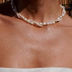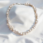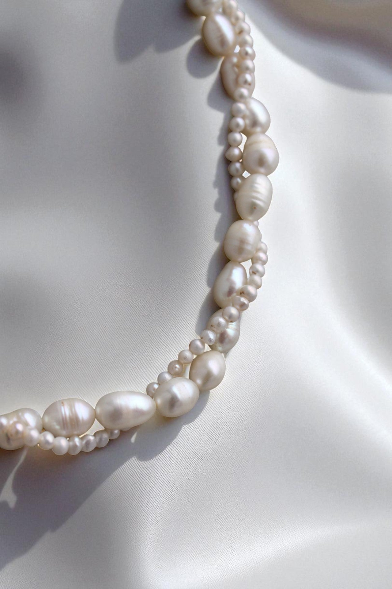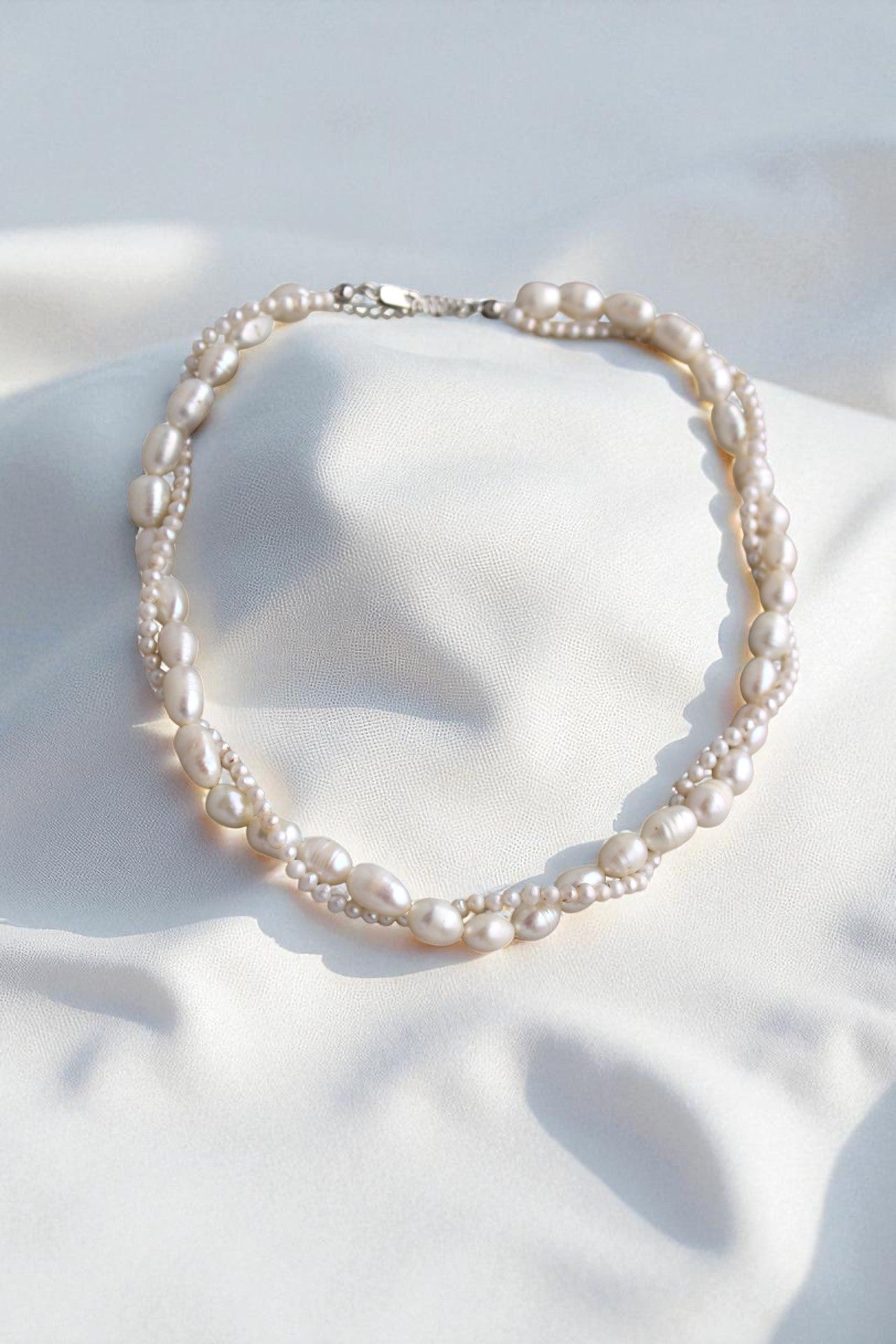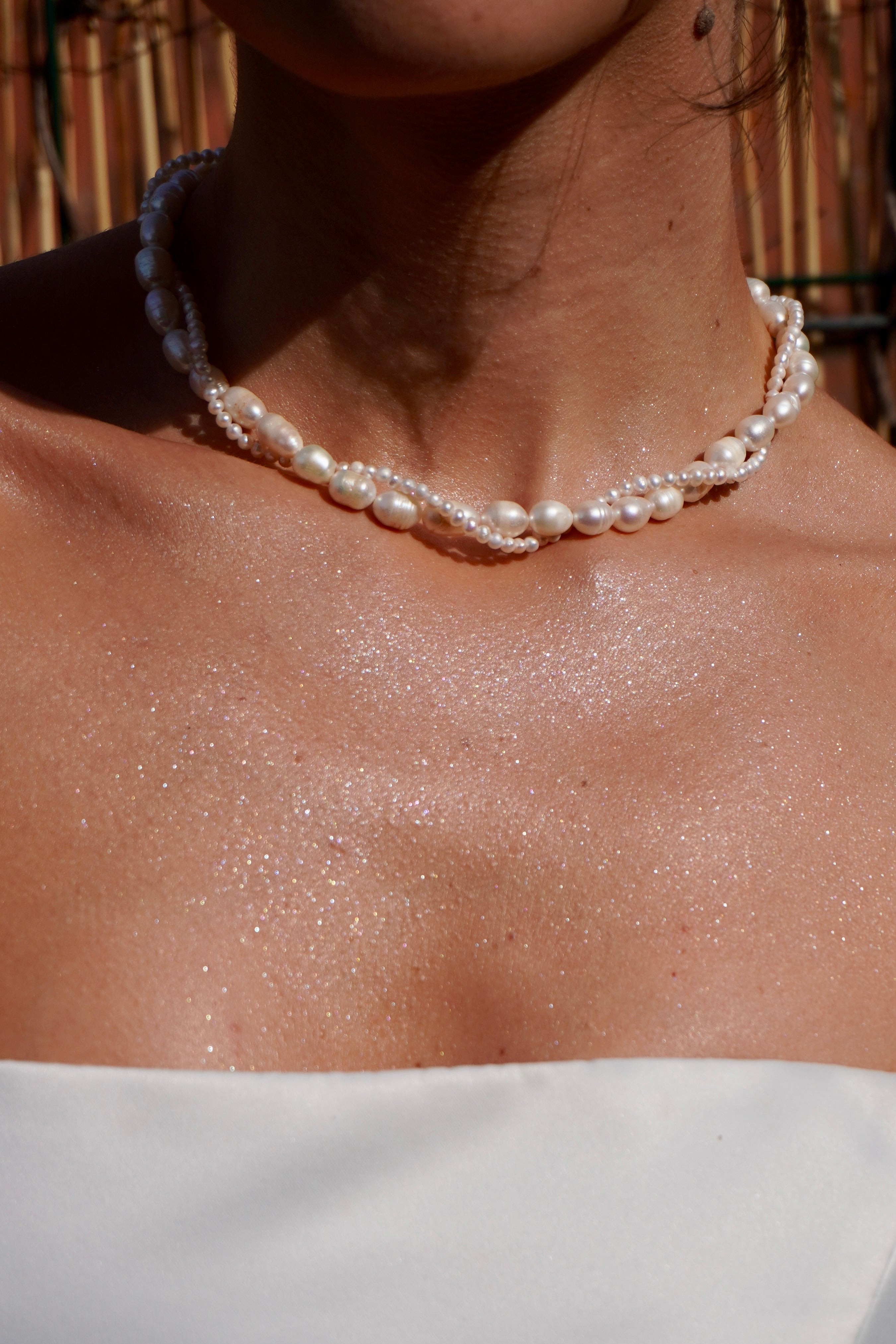 Două tipuri de perle de cultură, unite într-un dans delicat ce simbolizează întâlnirea a două suflete. Colierul împletește frumusețea naturală a perlelor cu eleganța argintului, fiind alegerea perfectă pentru o mireasă care își dorește rafinament și puritate în ziua nunții.
